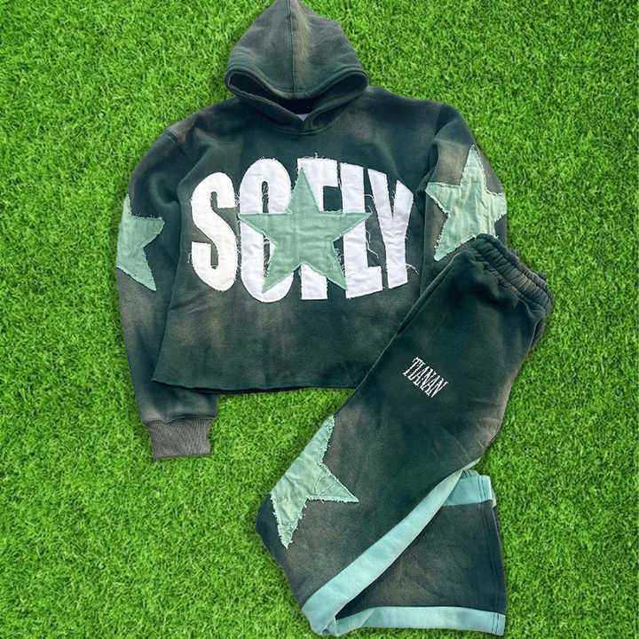 Custom Fashion Streetwear Hoodie Cropped Distressed Embroidery Heavyweight 500gms Acid Wash Hoodie Sweatshirt Set
