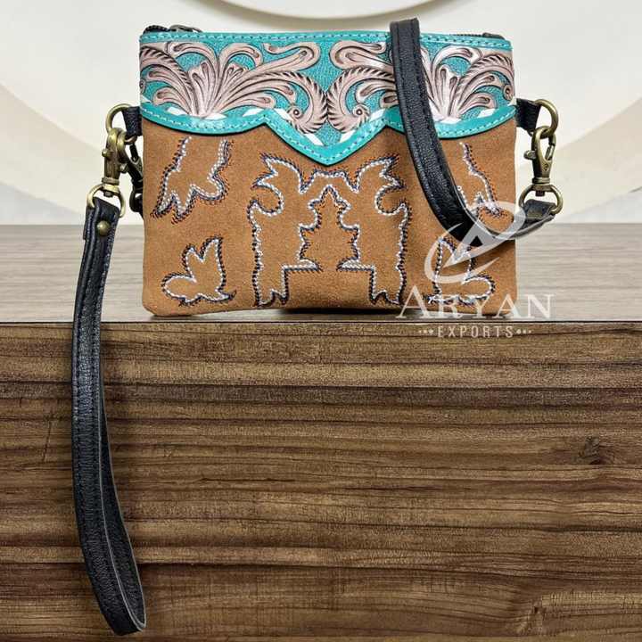 Hand Tooled Suede Leather Crossbody Bag with Wristlet