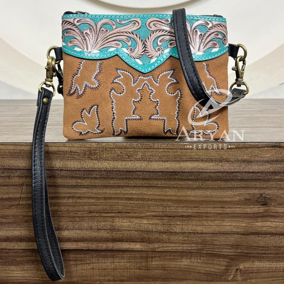 Custom Fashion Wholesale New Lady Collection High Quality Latest Hand Tooled Suede Leather Wristlet Crossbody Shoulder Mini Bags