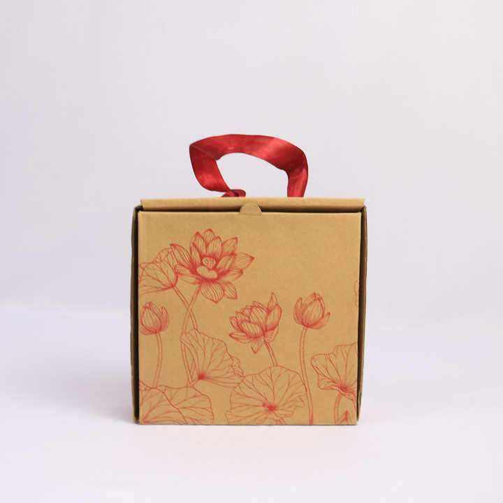 Custom Floral Corrugated Cake Box with Red Ribbon Handle Eco-Friendly Offset Printing Packaging From Vietnam
