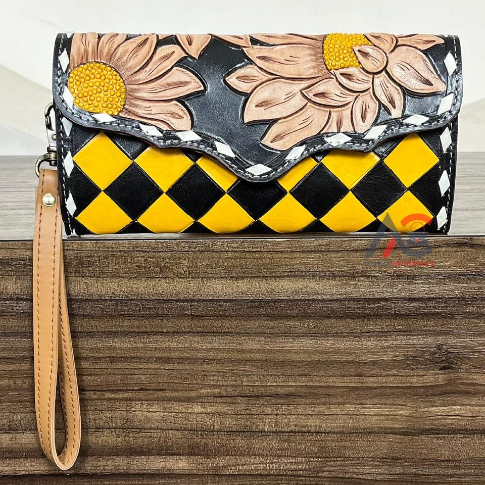 Custom Floral Tooled Checkered Leather Long Wallet Clutch RFID Secure Leather Travel Cash & Card Organizer Women Wristlet Purse