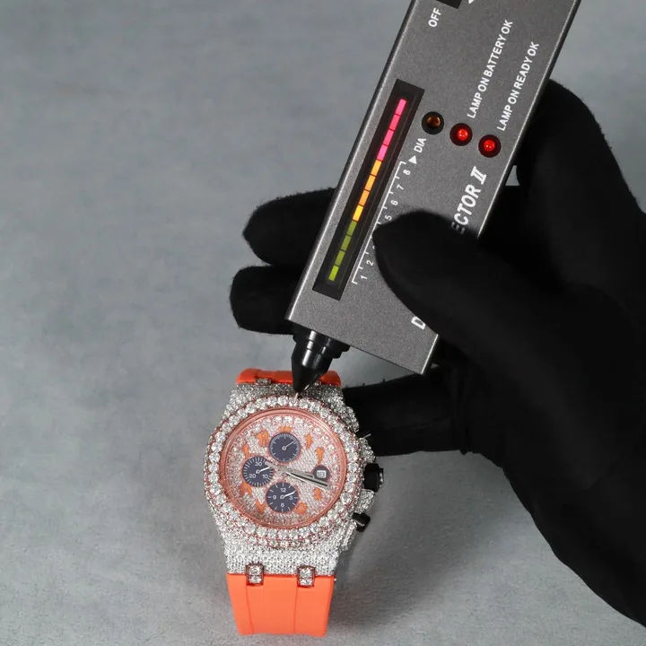 Custom Full Iced Out Round Moissanite Diamond Classic Date White Dial Features Diamond Watch For Men Gift in Orange Rubber Band