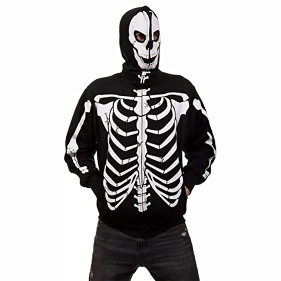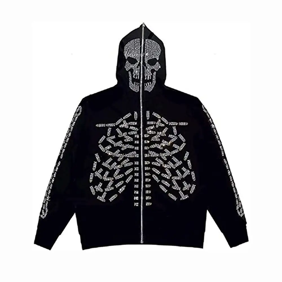 Custom Full Zip up Hoodie Street Wear Skull Skeleton Design Cotton Fleece Rhinestone Hoodies