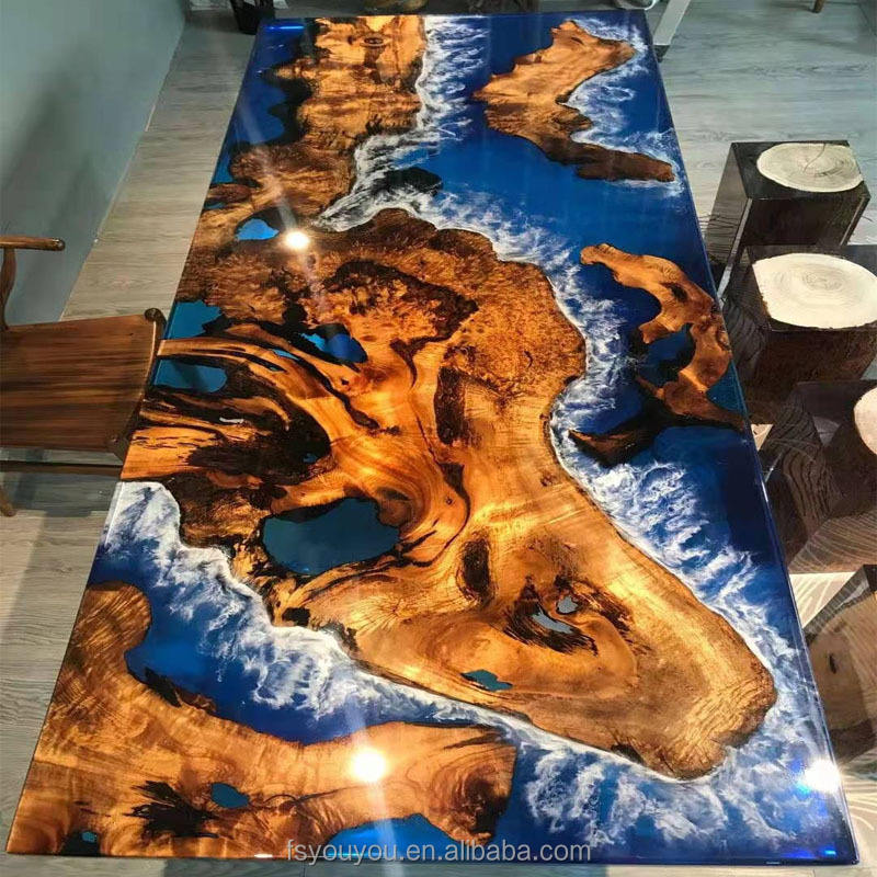 Custom Furniture Restaurant Dining Table Luxury Handmade River Resin Epoxy Table Top With Wooden Slab