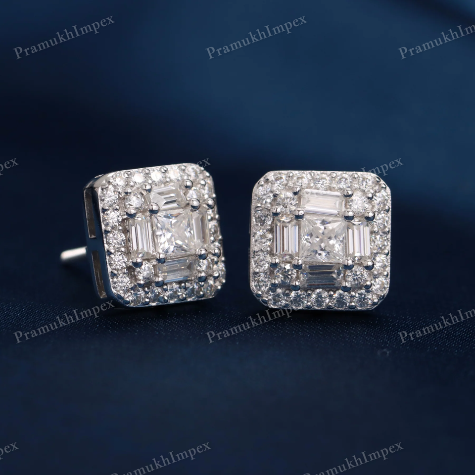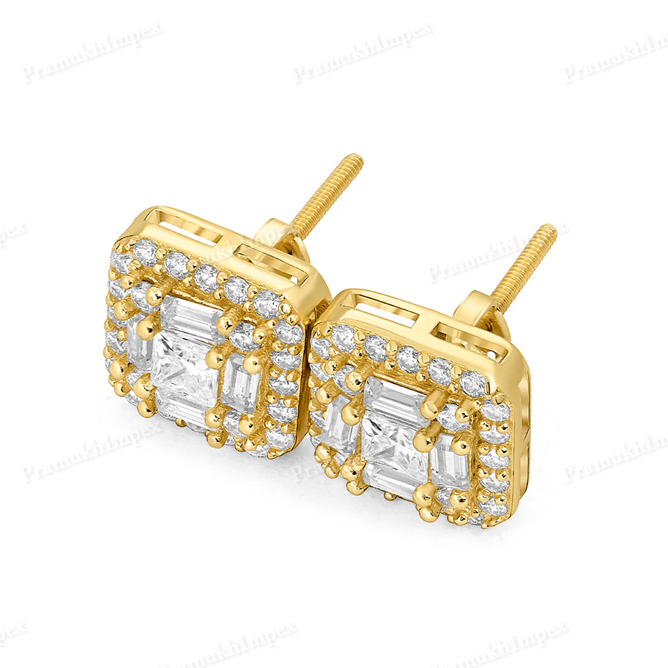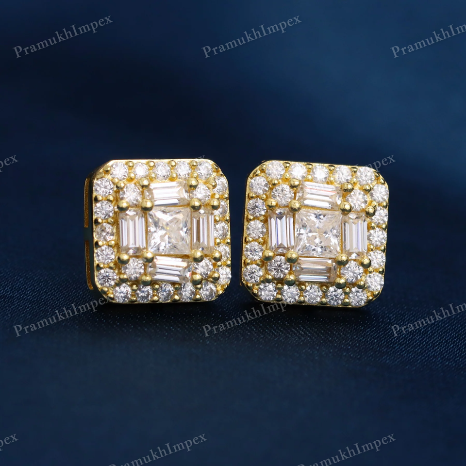 Custom Gold Plated Hip Hop Moissanite Stud Earring Fully Iced Out with Round Baguette Cut Clustered Stone Luxury Style Men Women