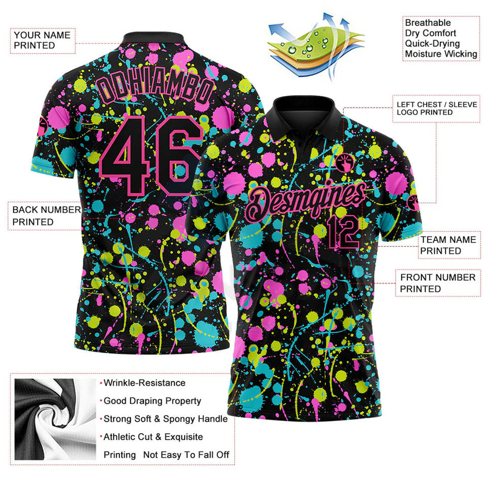 Custom Graffiti Pattern Black-Pink 3D Neon Splatter Performance Golf Polo Shirt Moisture-Wicking Breathable Athletic Polo