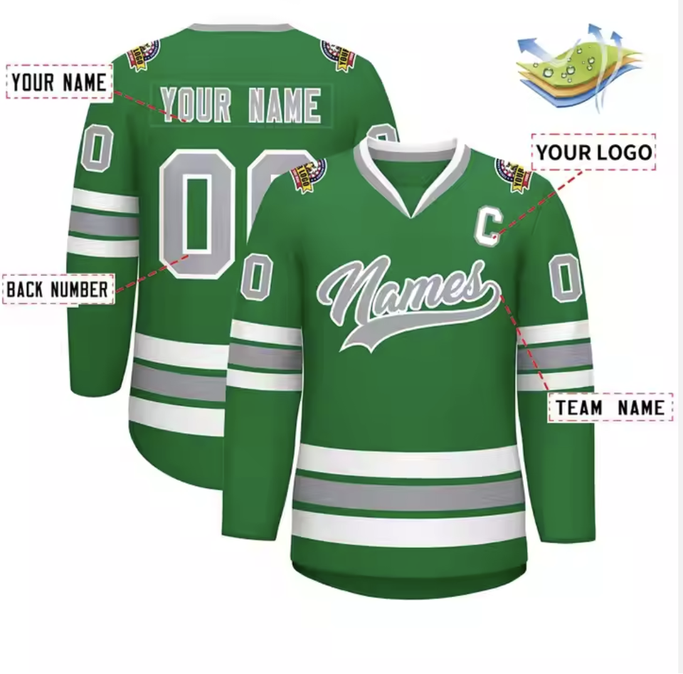 Custom Green White Anti-Bacterial Ice Hockey Jersey Team Name Captain Patch Number Personalized Long Sleeve Uniform 100%