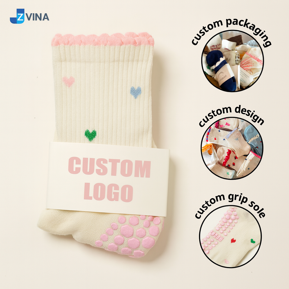Custom Grip Pilates Socks for Women Girls Custom Cotton Cute Heart Jacquard Design Ruffle Yoga Socks Manufacturer Hot Supplier