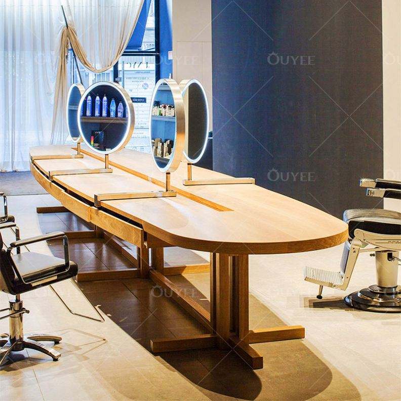 Custom Hair Salon Station Equipment Furniture Display Table Beauty Retail Shelves Beauty Shop Mirror for Barbershop
