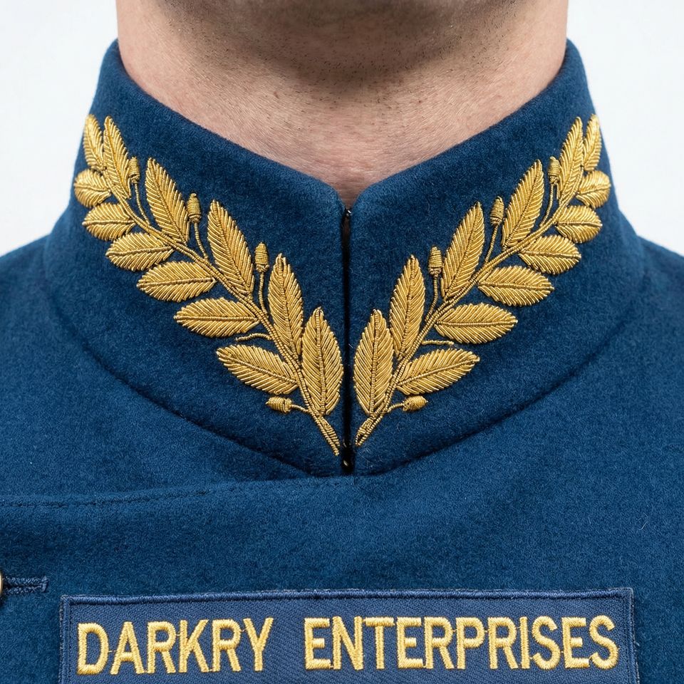 Custom Hand Gold Bullion Embroidery Deep Blue Collar Detailed Wheat Leaf Motif Bespoke Garment Apparel Manufacturing Service