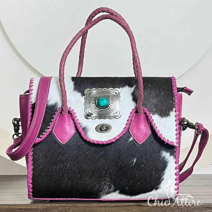 Custom Handcrafted Genuine Leather Hair On Cowhide Leather Tote Bag New Genuine Leather Turquoise Concho Women Casual Handbag