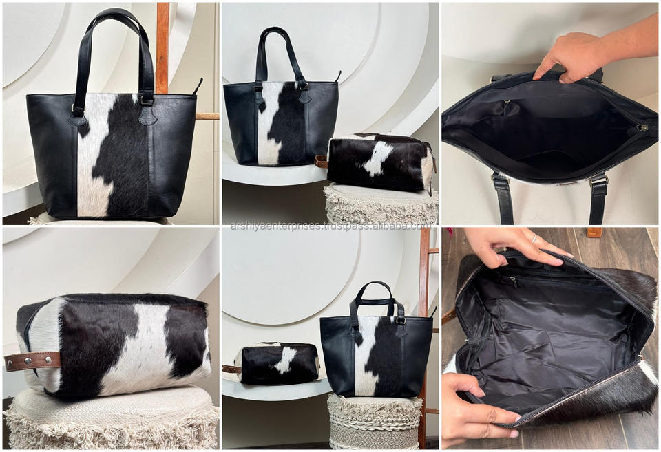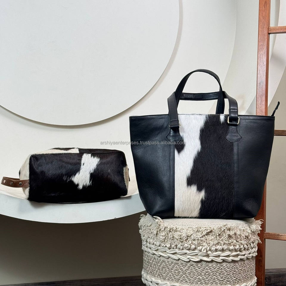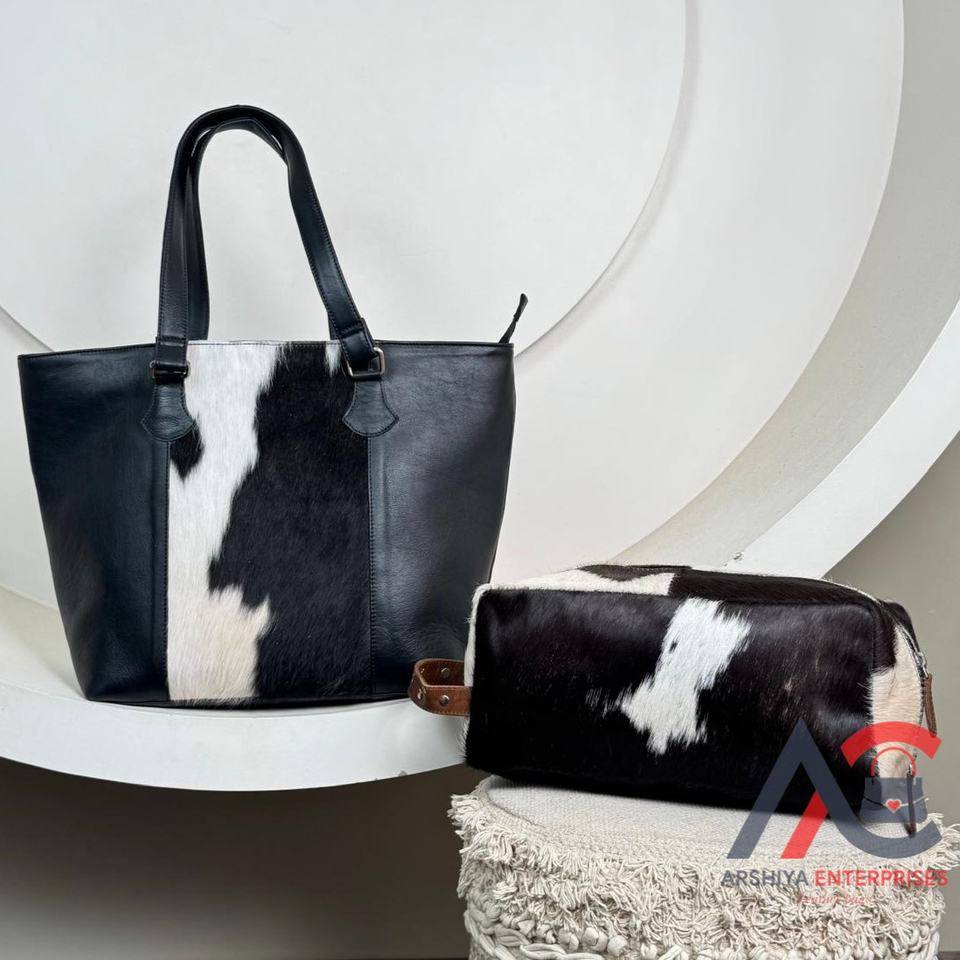 Custom Handmade 2-Piece Genuine Cowhide Leather Bag Set Hair-On Hide Tote Bags & Dopp Kit Travel Pouch for Women's OEM Available