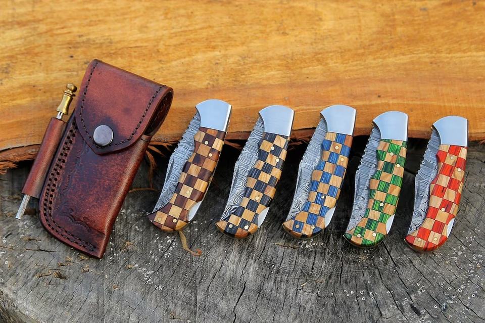 Custom Handmade Stainless Damascus Camping Folding Knife 3-Inch Blade Exotic Wood Handle Leather Case Engraving Wholesale