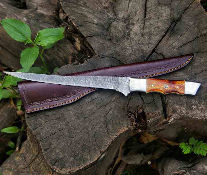Custom Handmade Damascus Steel Fishing Fillet Knife Kitchen Knives with Leather Sheath