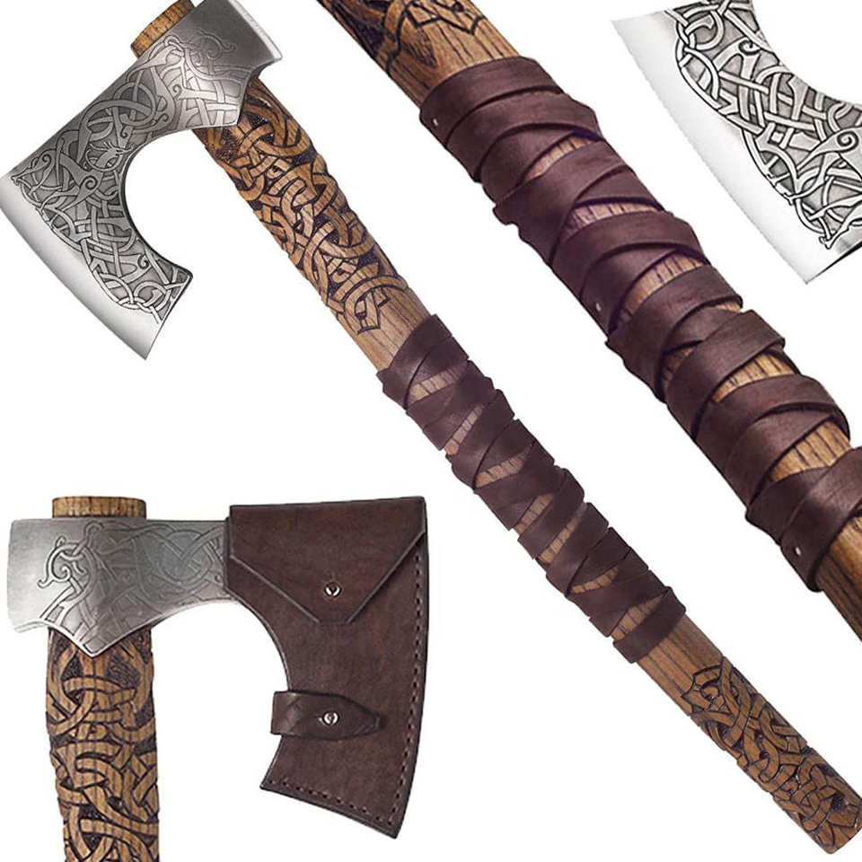 Custom Handmade Damascus Steel Viking Camping Axe Wood Handle Axes With Leather Sheath