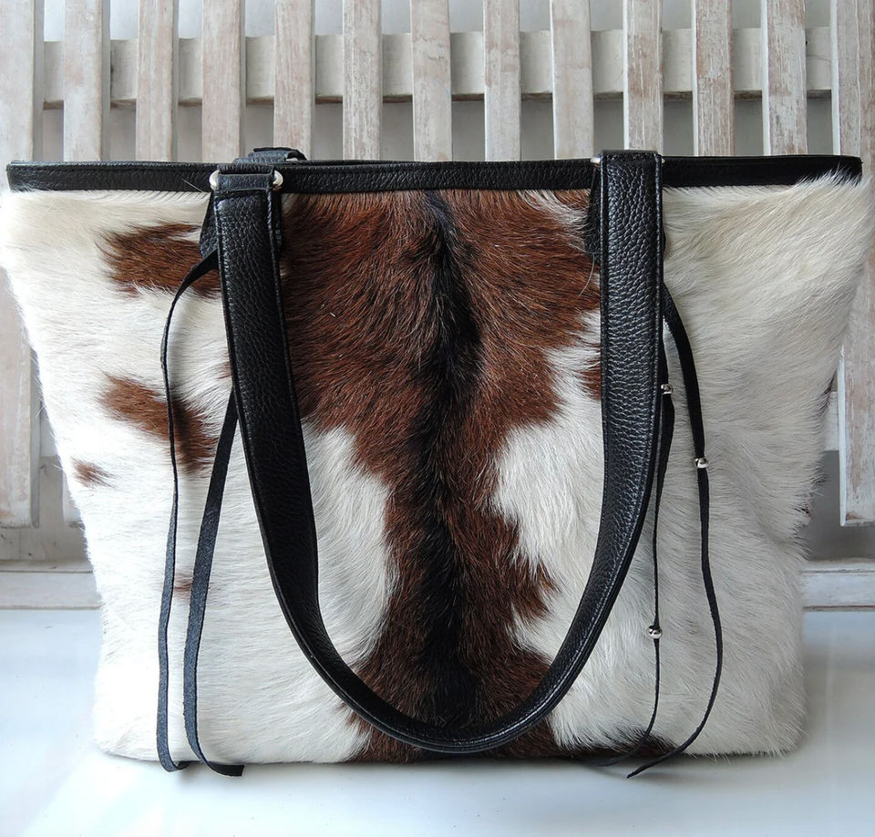 Custom Handmade Genuine Hair on Cowhide Leather Vintage Chains Large Capacity Durable Zipper Closure Shoulder Handbag for Women