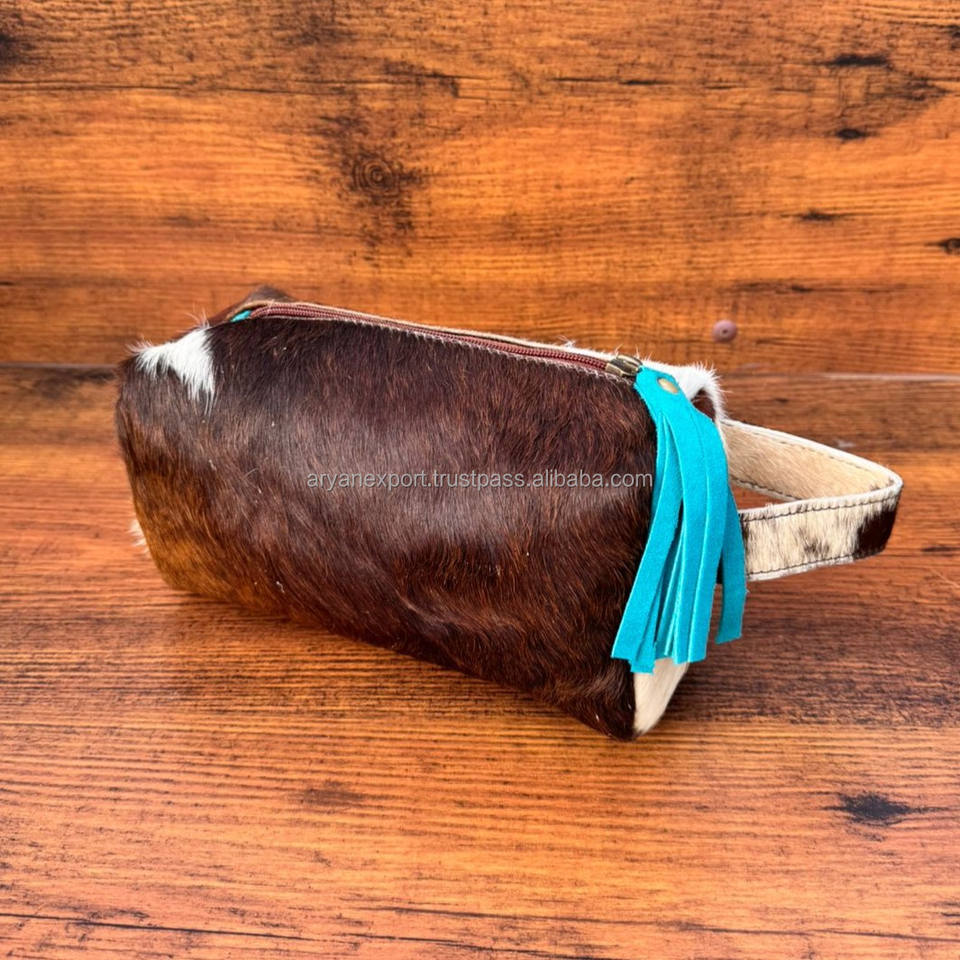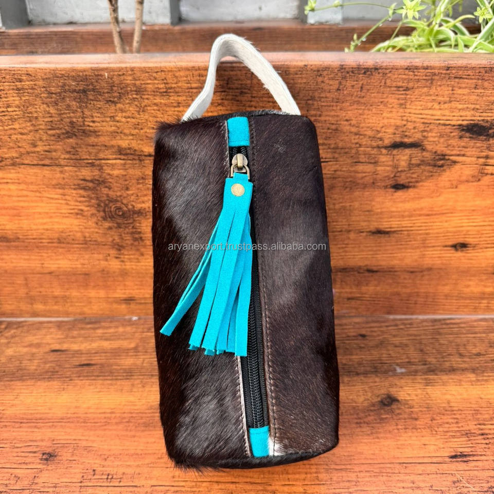 Custom Handmade Hair on Cowhide Turquoise Tassel Toiletry Bags for Women Western Genuine Leather Cosmetic Bag for Makeup Storage