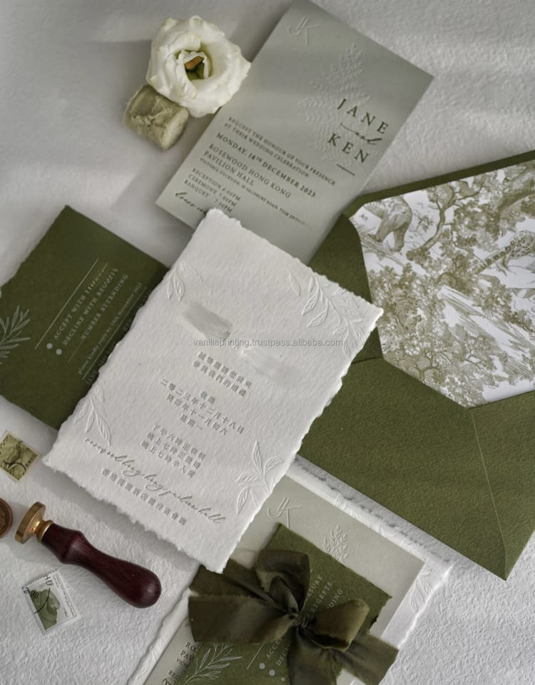 Custom Handmade Luxury Saga Green Embossed Paper Letterpress Wedding Invitation Cards with Envelopes Made in China
