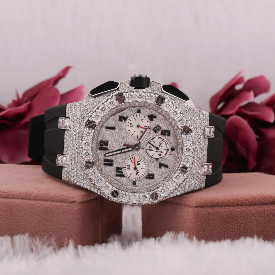 Custom Handmade Men's Wrist Watch with Half Iced White Dial VVS Moissanite Diamond Fully Customized Water Resistant Glass Window