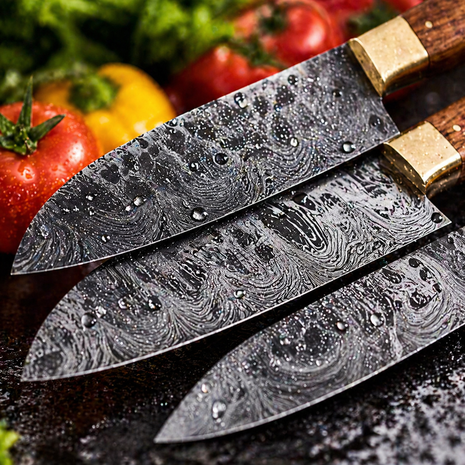 Custom Handmade Seven-Piece Chef Set Straight Edge Sharp Blades Damascus Steel Ambidextrous Wood Handle Leather Sheaths
