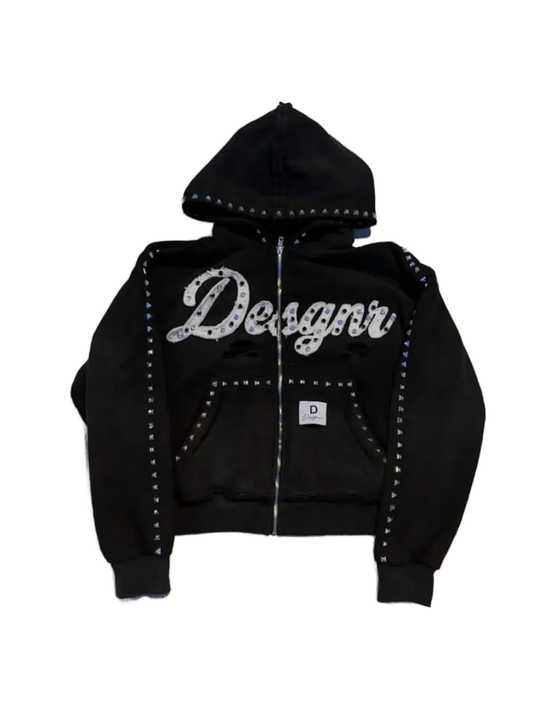 Custom Heavyweight Acid Wash Embroidered Winter Crop Top Fashion Street Wear Cut and Sew Rhinestone Zip Up Hoodie