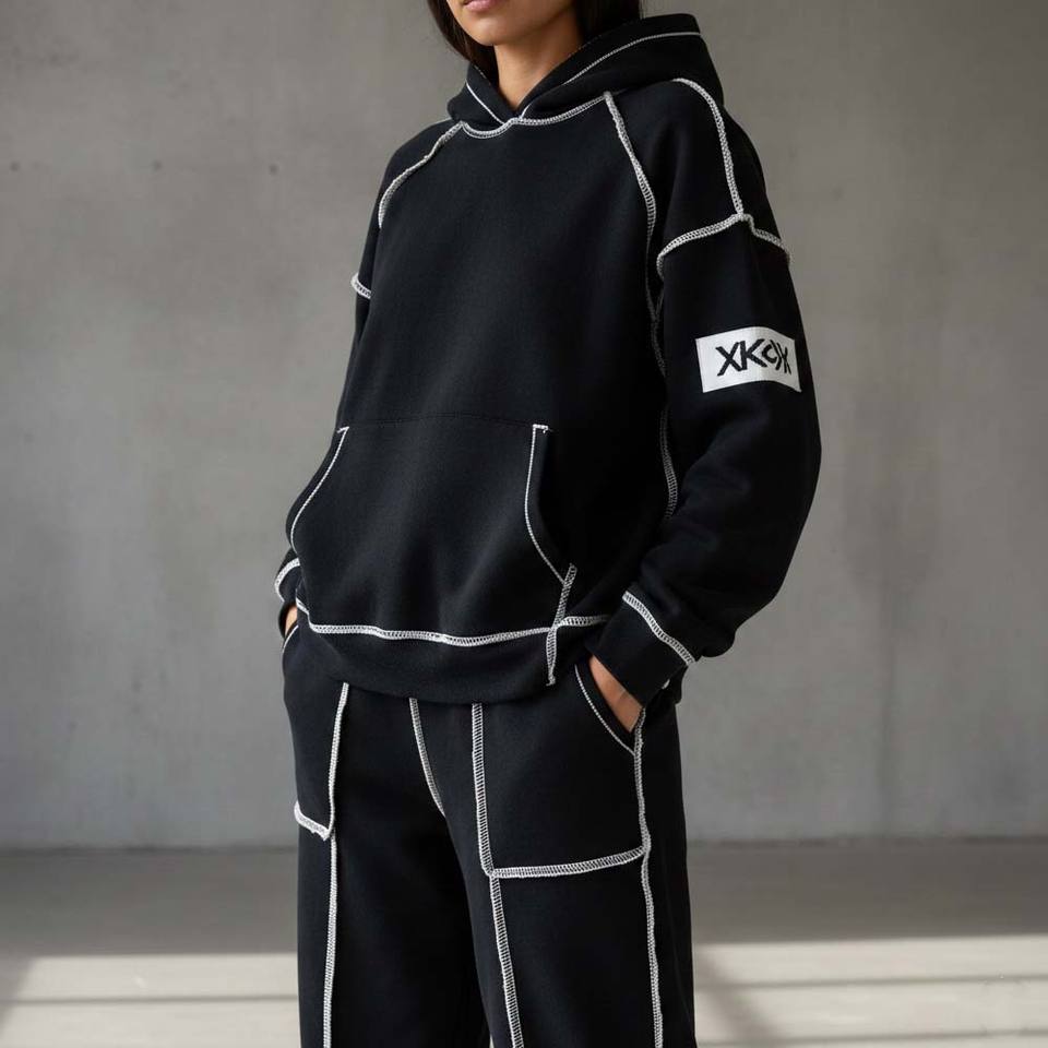 Custom Heavyweight Cotton Women's Streetwear Tracksuit Skinny Fit Short Top Two Piece Set Black Contrast White Stitching