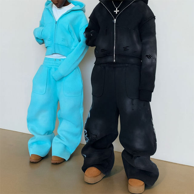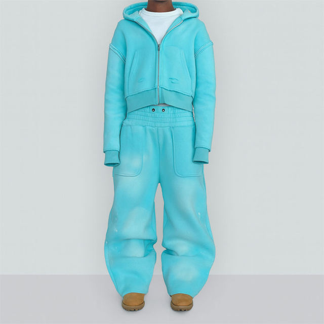 Custom Acid Wash Solid Heavyweight Cropped for Tracksuit Rhinestone Hoodie Flared Sweats Pant Hoodie Sets
