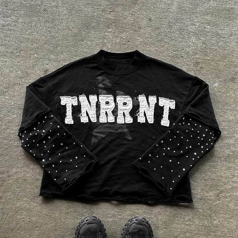 Custom Heavyweight Washed Distressed Patchwork Embroidery Double Layer Long Sleeve T-shirt Cotton Boxy Rhinestone tShirt for Men