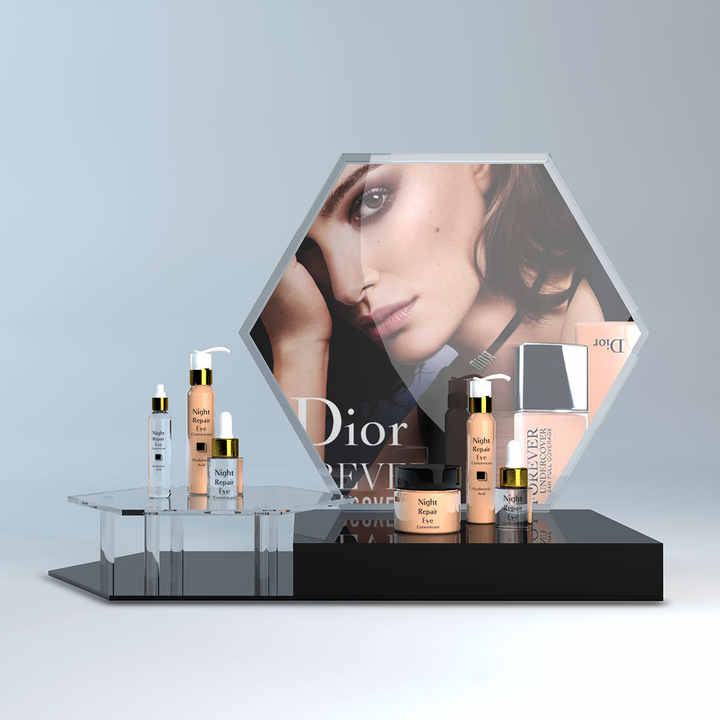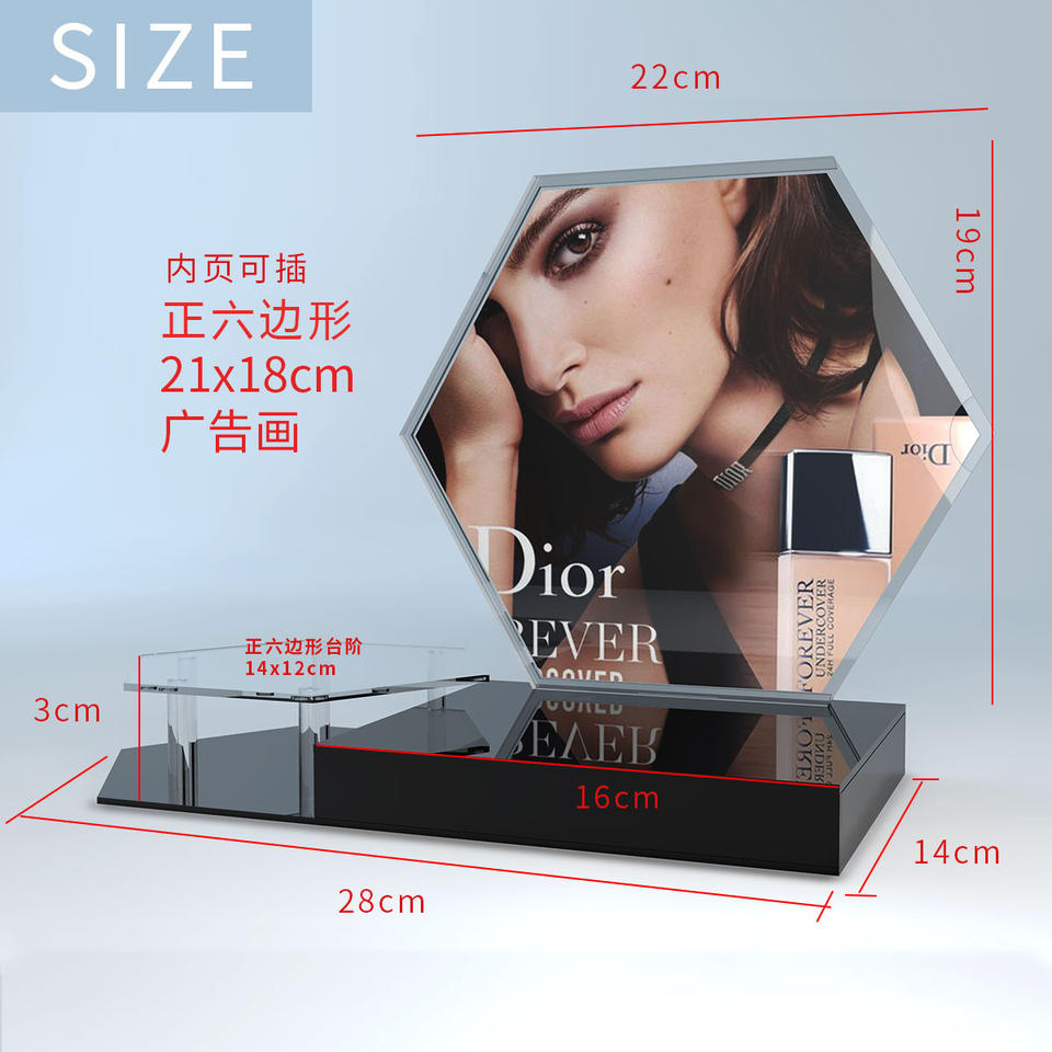Custom Hexagonal Acrylic Display Rack, Countertop Cosmetic Showcase with Picture Frame for Beauty Store
