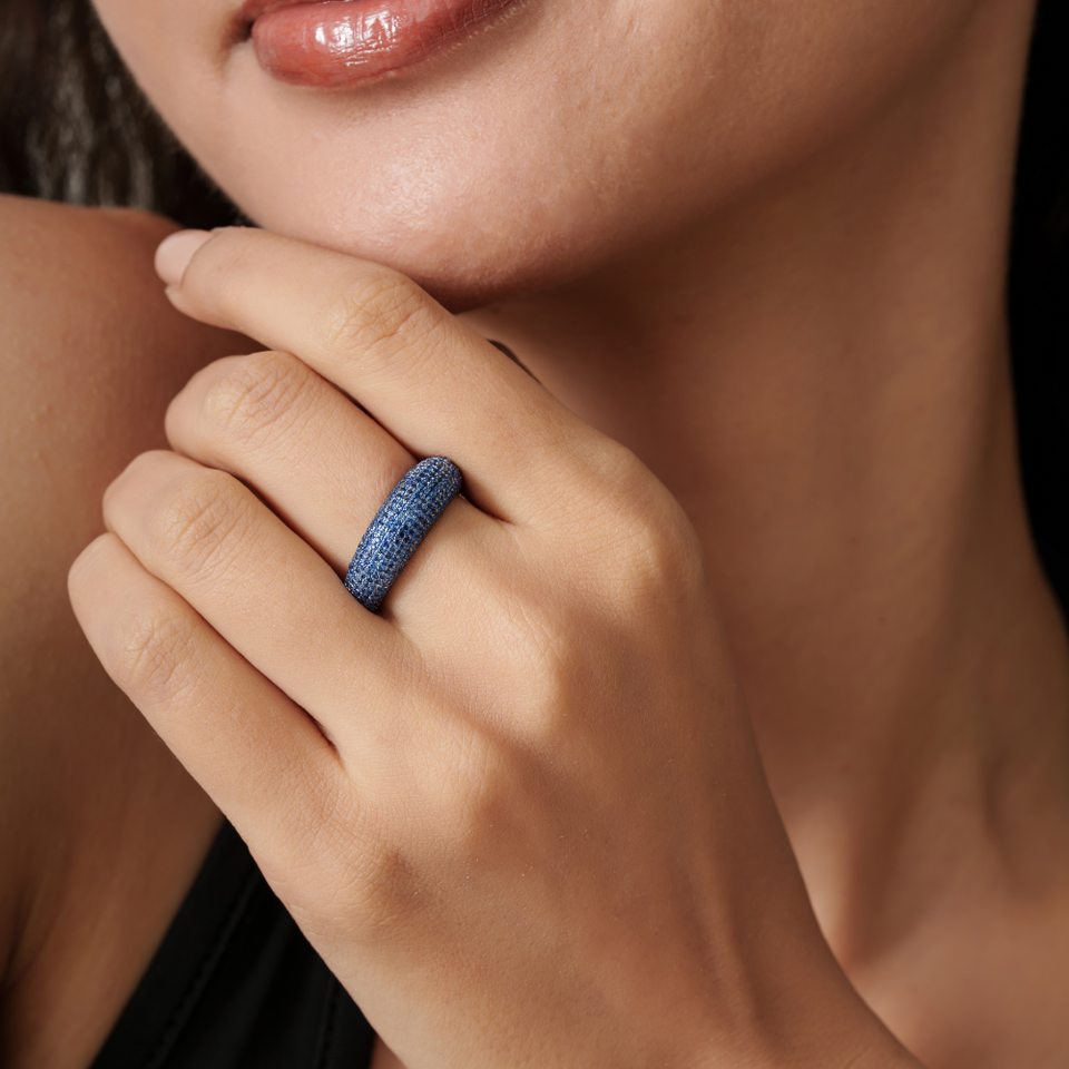 Custom High End Full Pave Setting Blue Sapphire Chunky Dome Ring K14 Solid White Gold Fine Unisex Wedding Jewelry Manufacturer