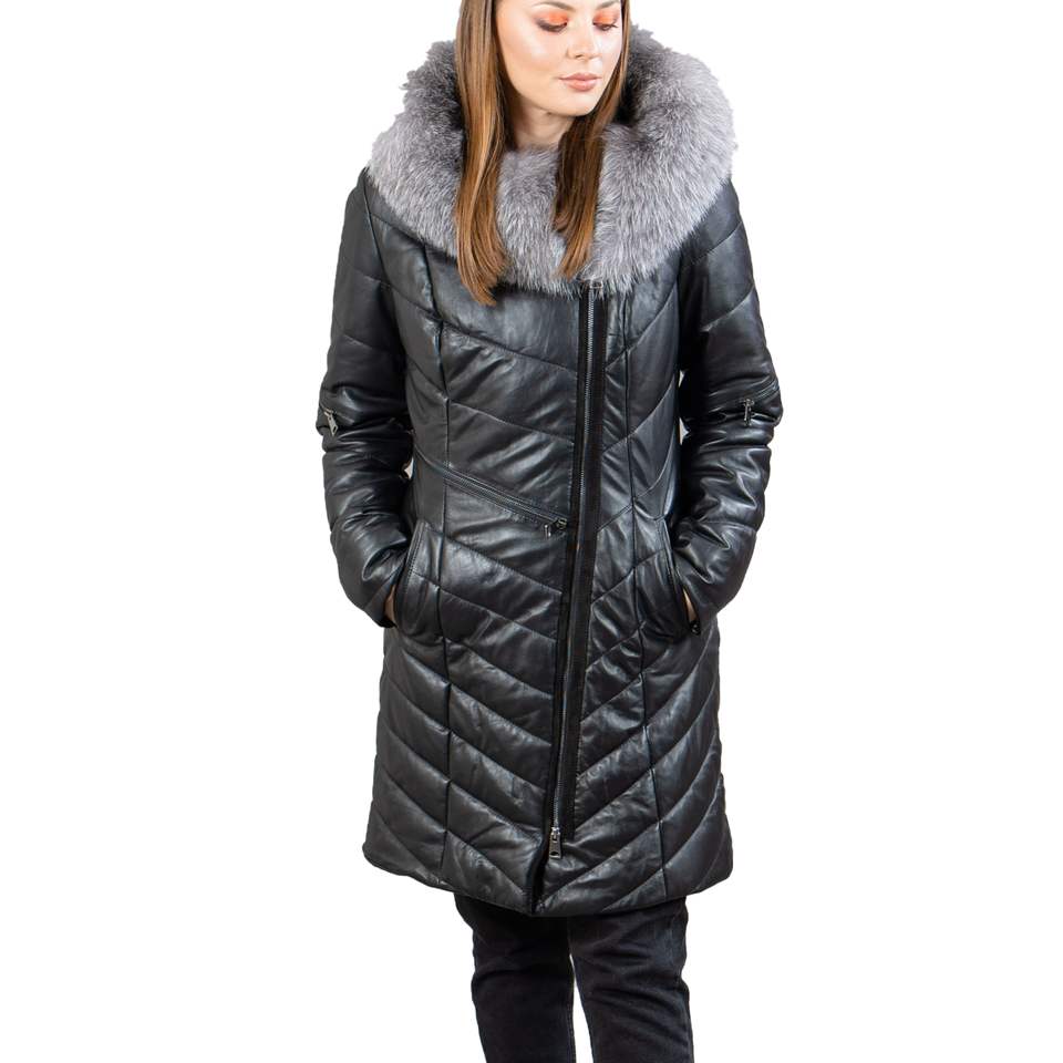 Custom High Quality Leather Long Coat Jacket with fox Fur Collar Zip Close Fashion Wear Full Heated Bomber Jacket