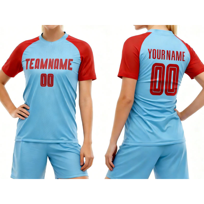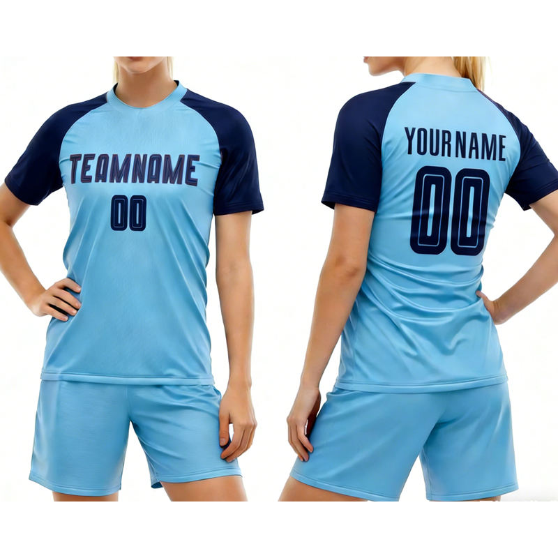 Custom High Quality Polyester Fiber Raglan Sleeve Blank Soccer Jersey Uniform for Printing Women Light Blue Football Jersey