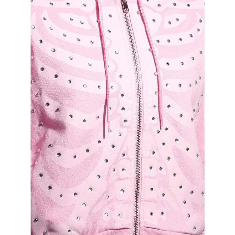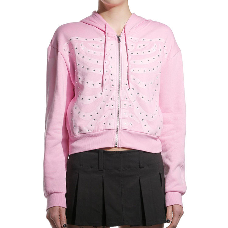 Custom High Quality Zip up Hoodie Crop Top Rib Hem Long Sleeve Pink Rib Cage Rhinestone Girls Women Hoodie