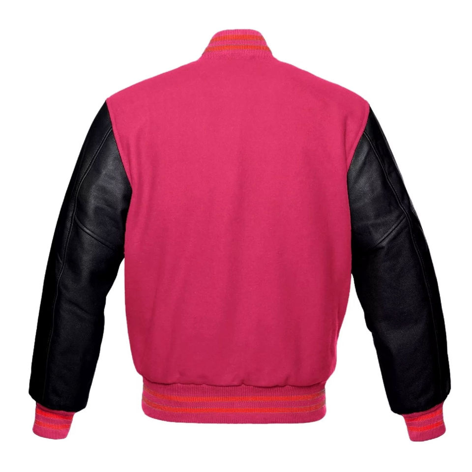 Custom High Street Men's Varsity Jacket Hot Pink Wool Black Leather Sleeves Patchwork Front for College Baseball Players Kids