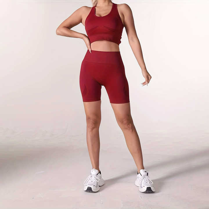 Custom Hot Red Shoulder Cutout Ribbed Crop Top and Biker Shorts Set for Women Gym High Quality Stretchy Knit Fabric