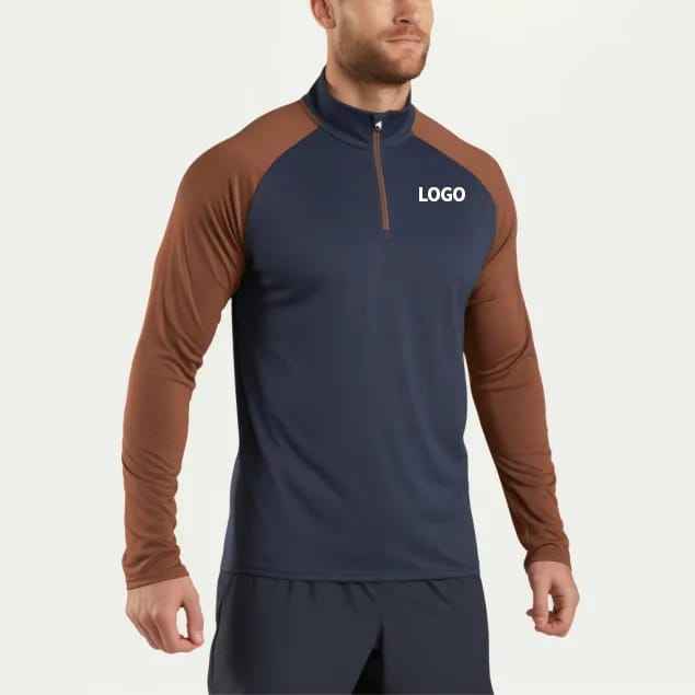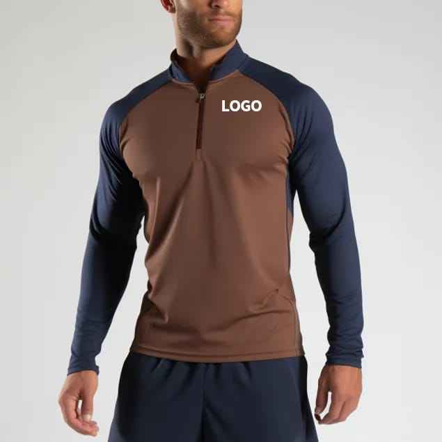 Custom Hucai Mens Long Sleeve O-Neck Half Zip Sporty Fleece Training Top Gym Wear Muscle Zip Athletic Sports Shirt