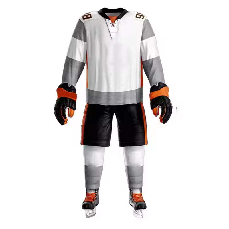 Custom Ice Hockey Uniform White Grey Orange Black Gold Stitched Player Name Number Jersey Shorts Socks Gloves Full Team Sports