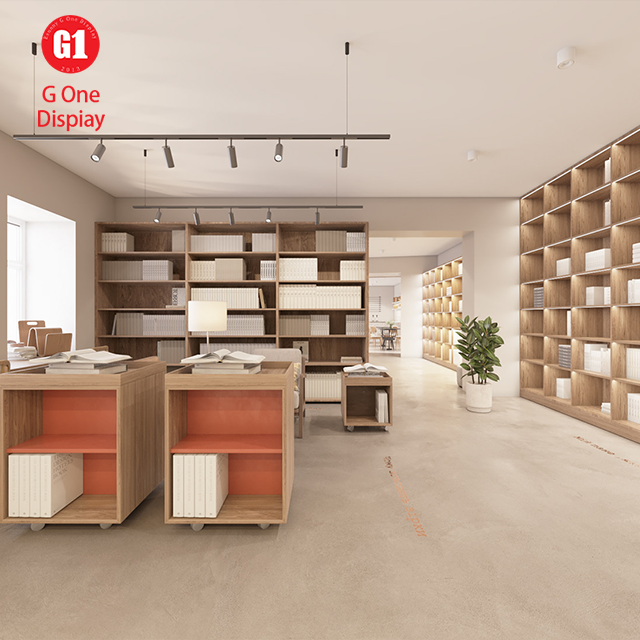 Custom Indoor Display Bookcase Design Wooden Wall Book Shelf Cabinet with LED Lighting Library Furniture Decor
