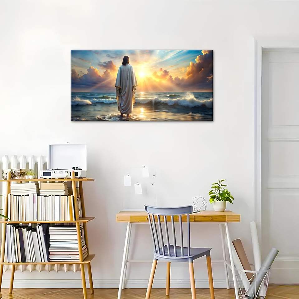 Custom Jesus Walking on Water Canvas Panel Wood Frame Wall Art Sunset Ocean Christian Religious Print No Tax Church Home Decor