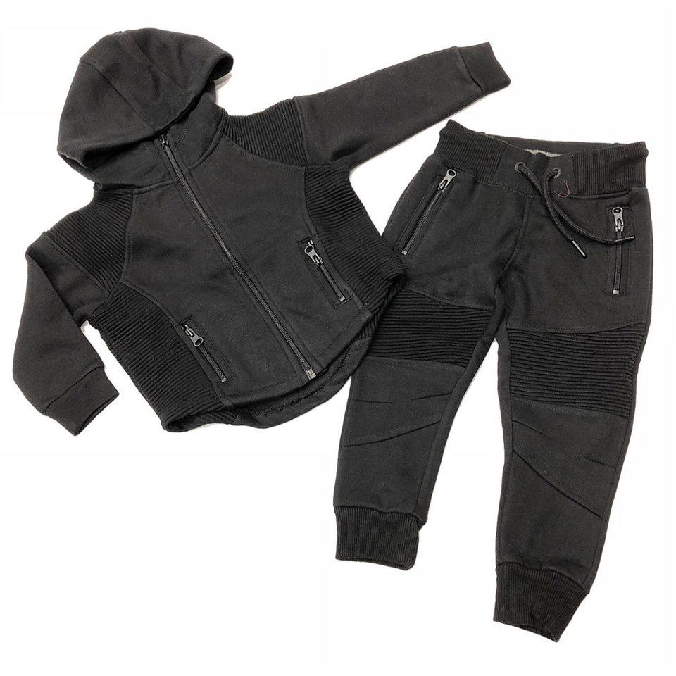 Custom Kids Black Moto Style Tracksuit Set Zip Hoodie and Joggers Soft Cotton Blend Personalized Logo Outfit