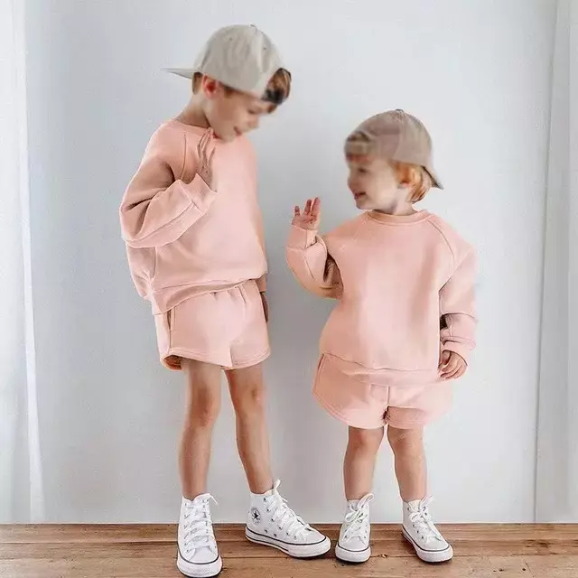 Custom Kids Matching Outfit Set Boys Girls Winter Fleece Hooded Short Sleeve Sweatshirt Shorts Two Piece Tracksuit Casual
