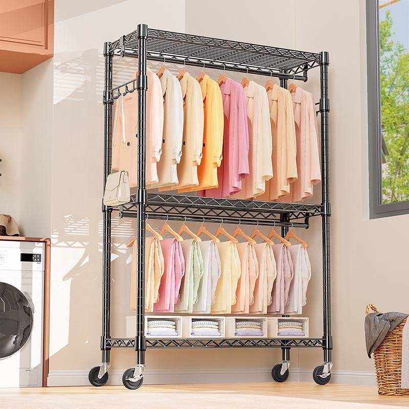 MZG Custom LOGO Black Modern Chrome Heavy-Duty 3-Tier Rolling Garment Rack Adjustable Wire Shelving Rods Side Hooks Living Room