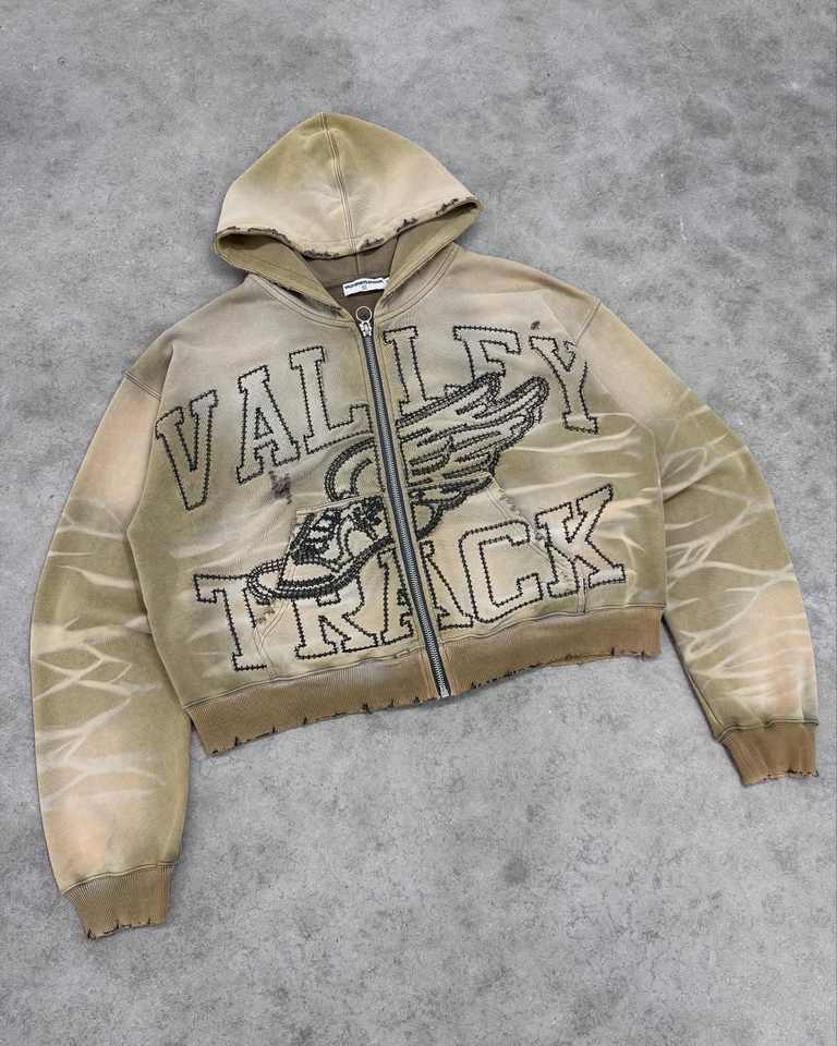 Custom Label Distressed Embroidery Patch Cotton Acid Washed Mens Zip up Rhinestone Hoodie