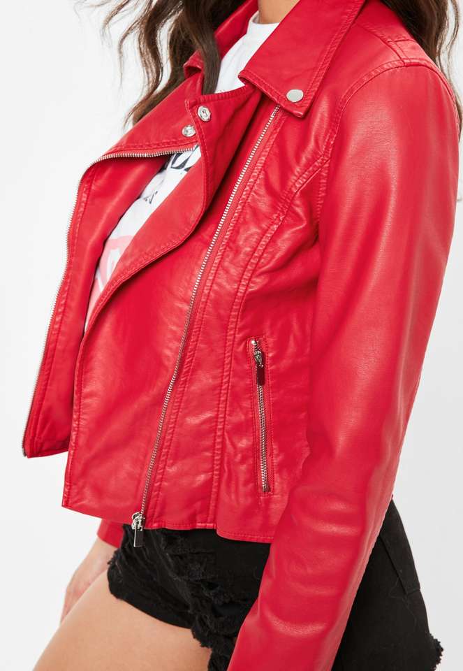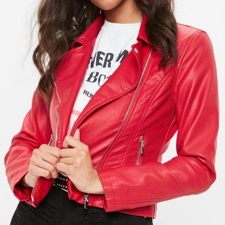 Custom Ladies Red Leather Biker Short Jacket Plus Size Windproof with Stand Collar Breathable Nylon Lining Woven Weaving Method