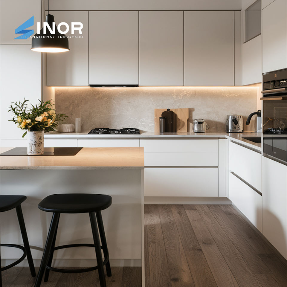 Custom Laminate Kitchen Cabinets Durable Water-Resistant Finish Soft Close Doors Drawer Dividers Featuring Marble Faucet