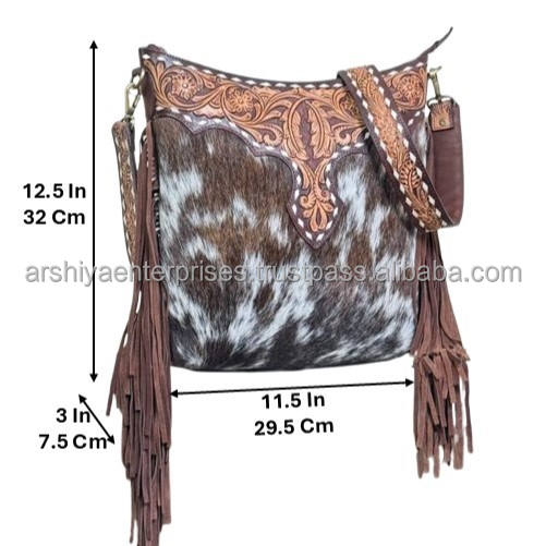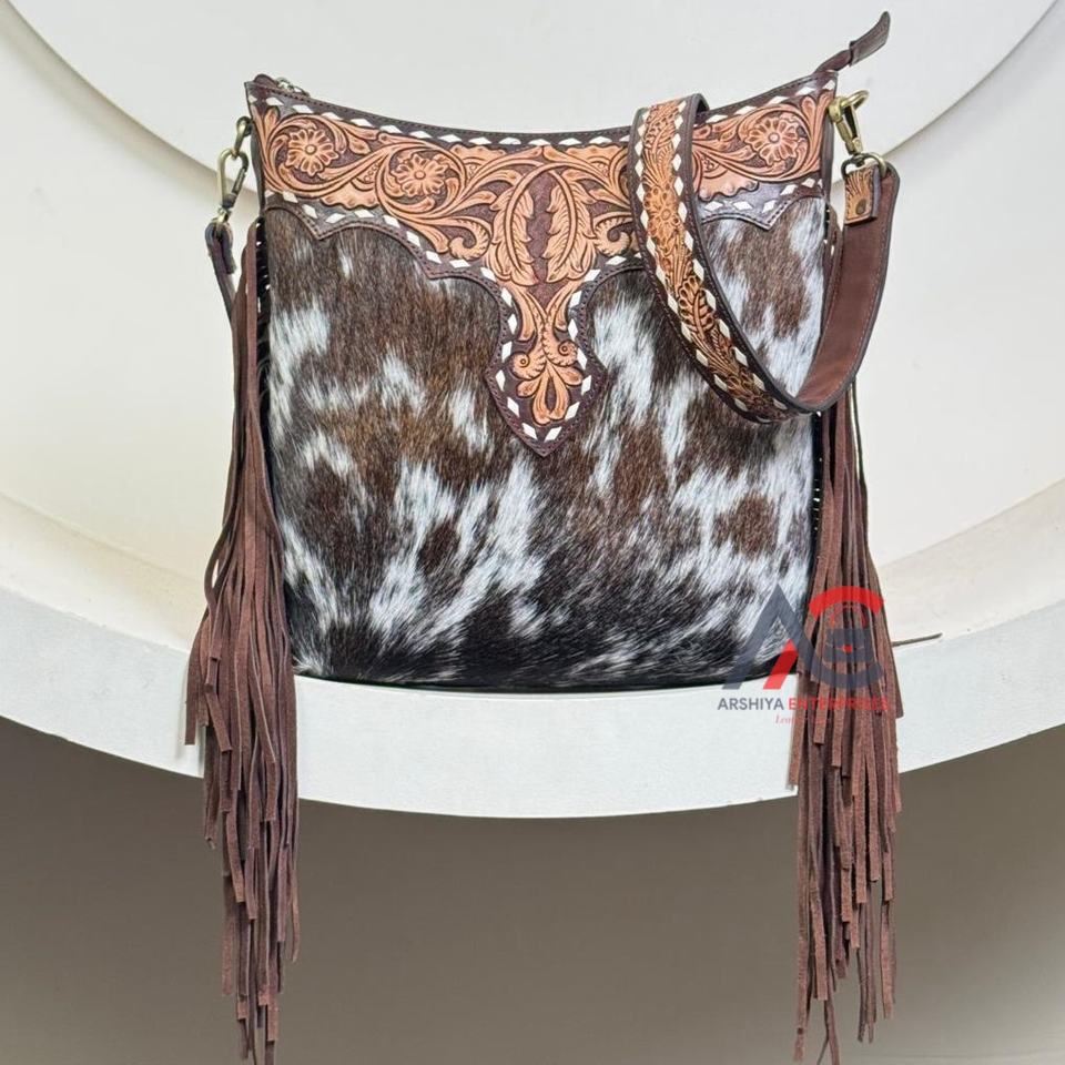 Hand Tooled Cowhide Leather Large Fringe Crossbody Bag