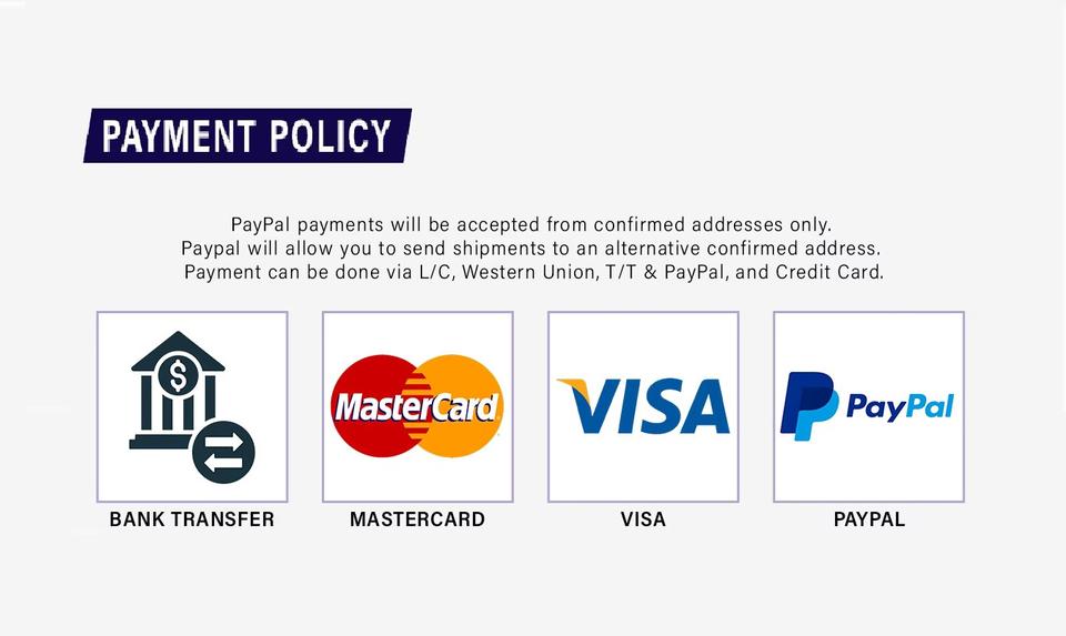 Payment:T/T - Pay Pal - bank to Bank Transfer