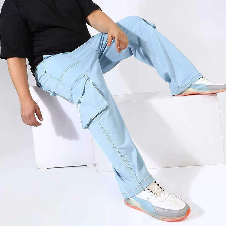 Custom Lightweight Casual Men's Baggy Street Wear Style Denim Jeans Side Button Flared Stacked Design Breathable Comfortable