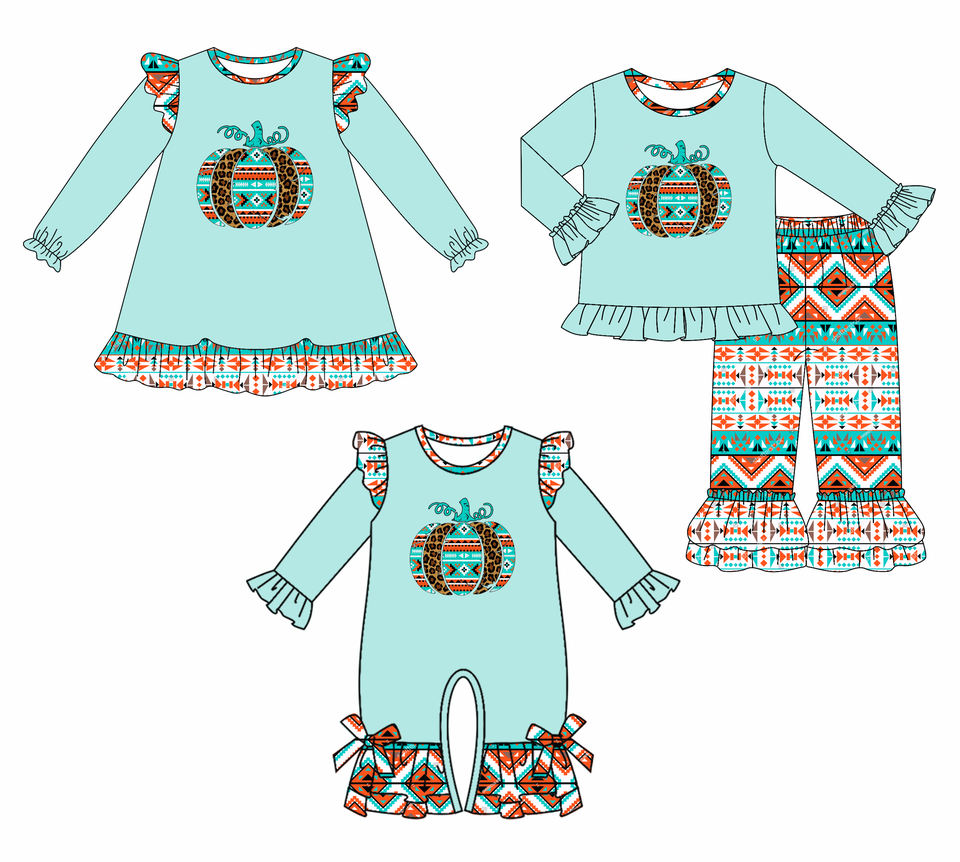 Custom Little girl Boutique green pumpkin print fall outfits kids wholesale toddler girl long sleeve child clothing set