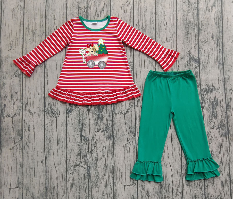Custom Little girl red stripe Christmas deer trees embroidery fall outfits kids wholesale girl long sleeve child clothing set